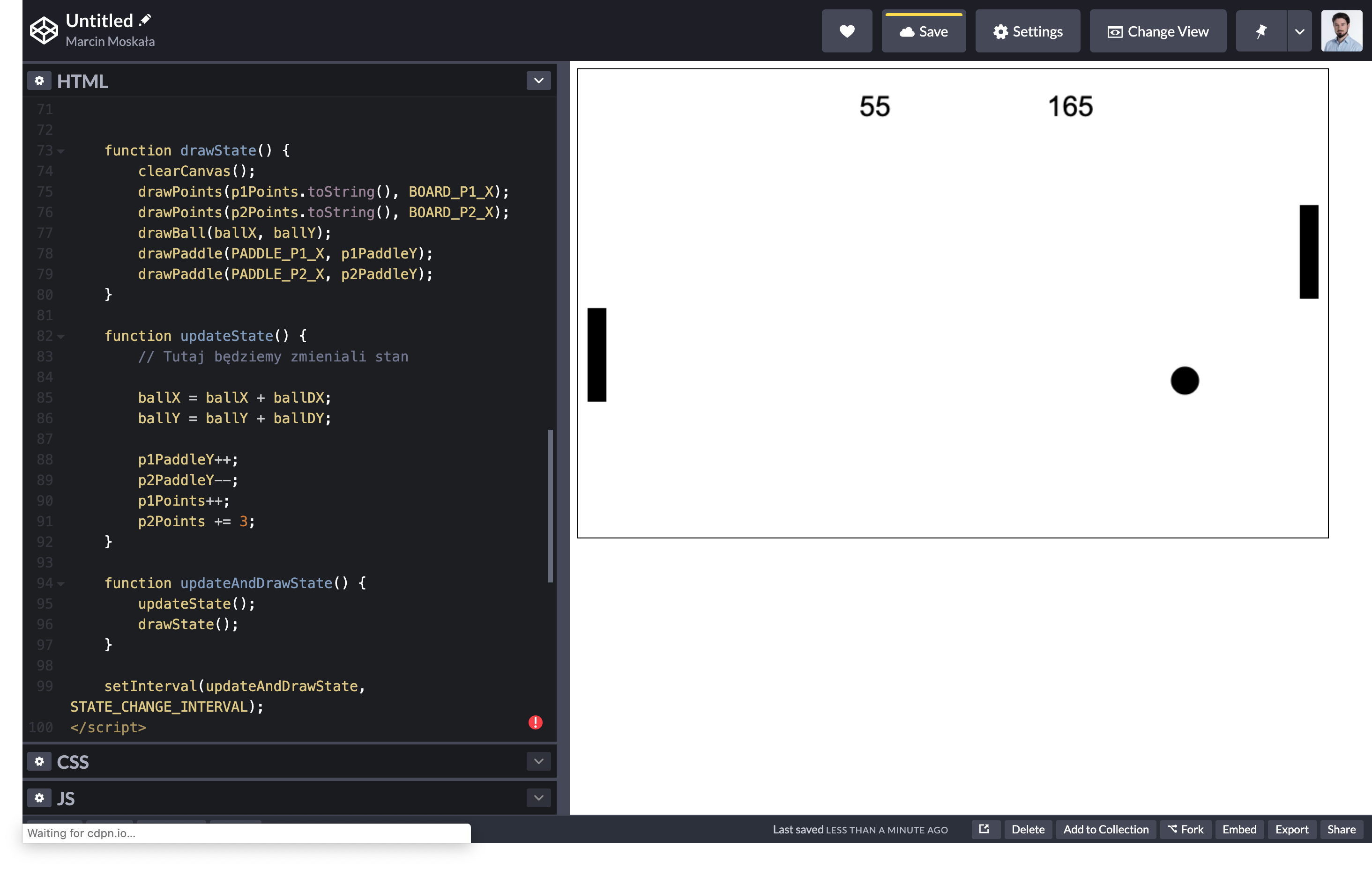 Aktualny stan gry w CodePen z przykładową zmianą stanu punktów i pozycji paletek.