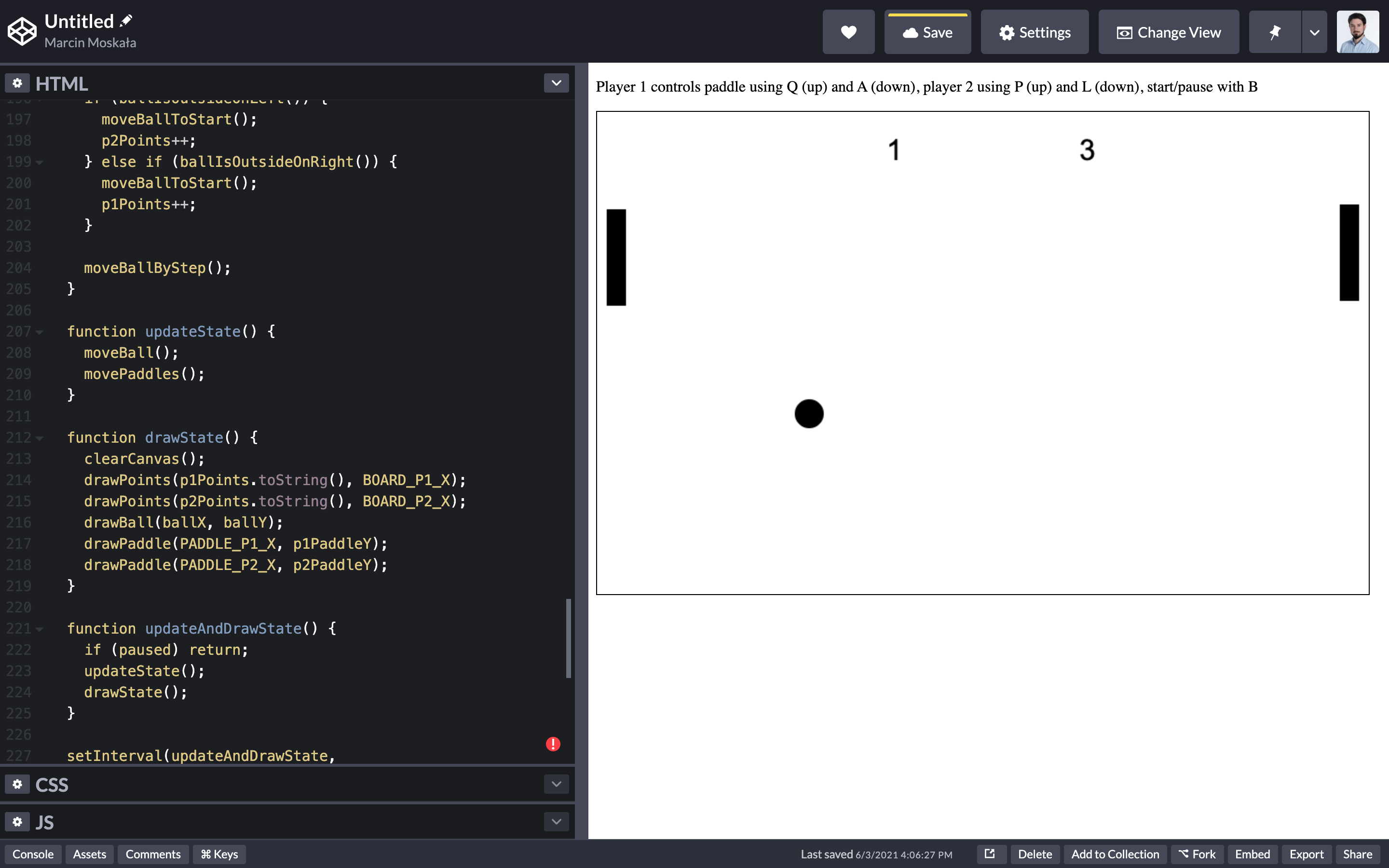Math.random()). - Przy odbiciu albo po powrocie na środek, piłeczka może nieznacznie przyspieszać (pamiętaj uwzględnić to przy marginesie odbicia od paletki, by krok nie był większy niż sam margines).