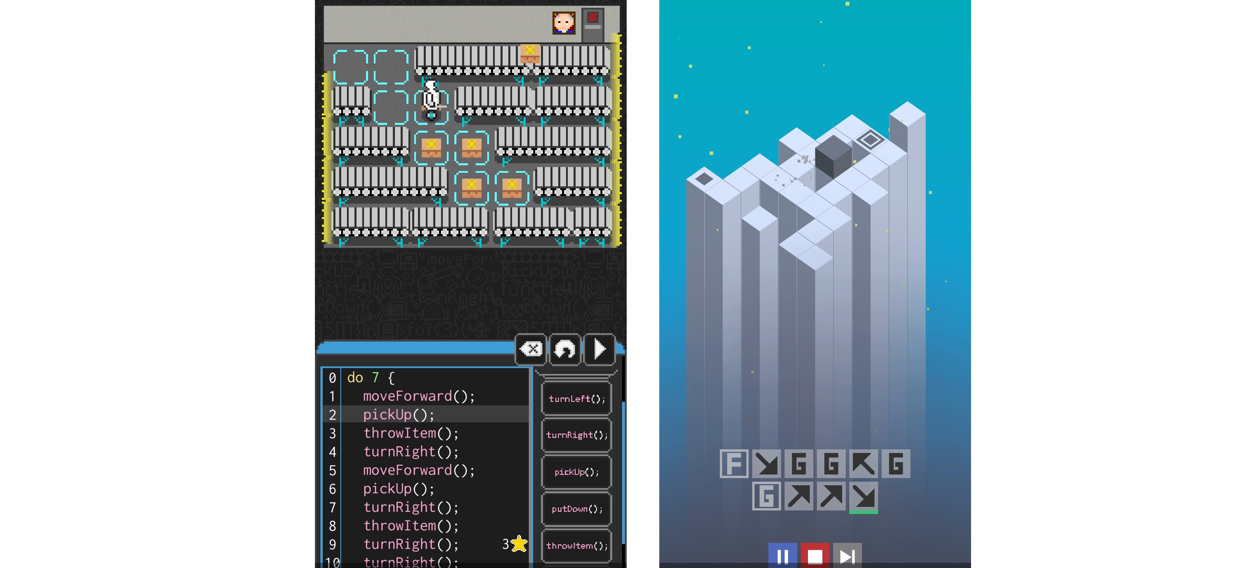 Tak jak mówiliśmy o grach programistycznych na komputer, tak też można znaleźć gry na telefon, które ćwiczą myślenie programistyczne. Warto potraktować je jako dodatek do zgłębiania programowania, tak jak łamigłówki przy nauce matematyki. Poniżej screeny z gier Automaton oraz Cursivity.