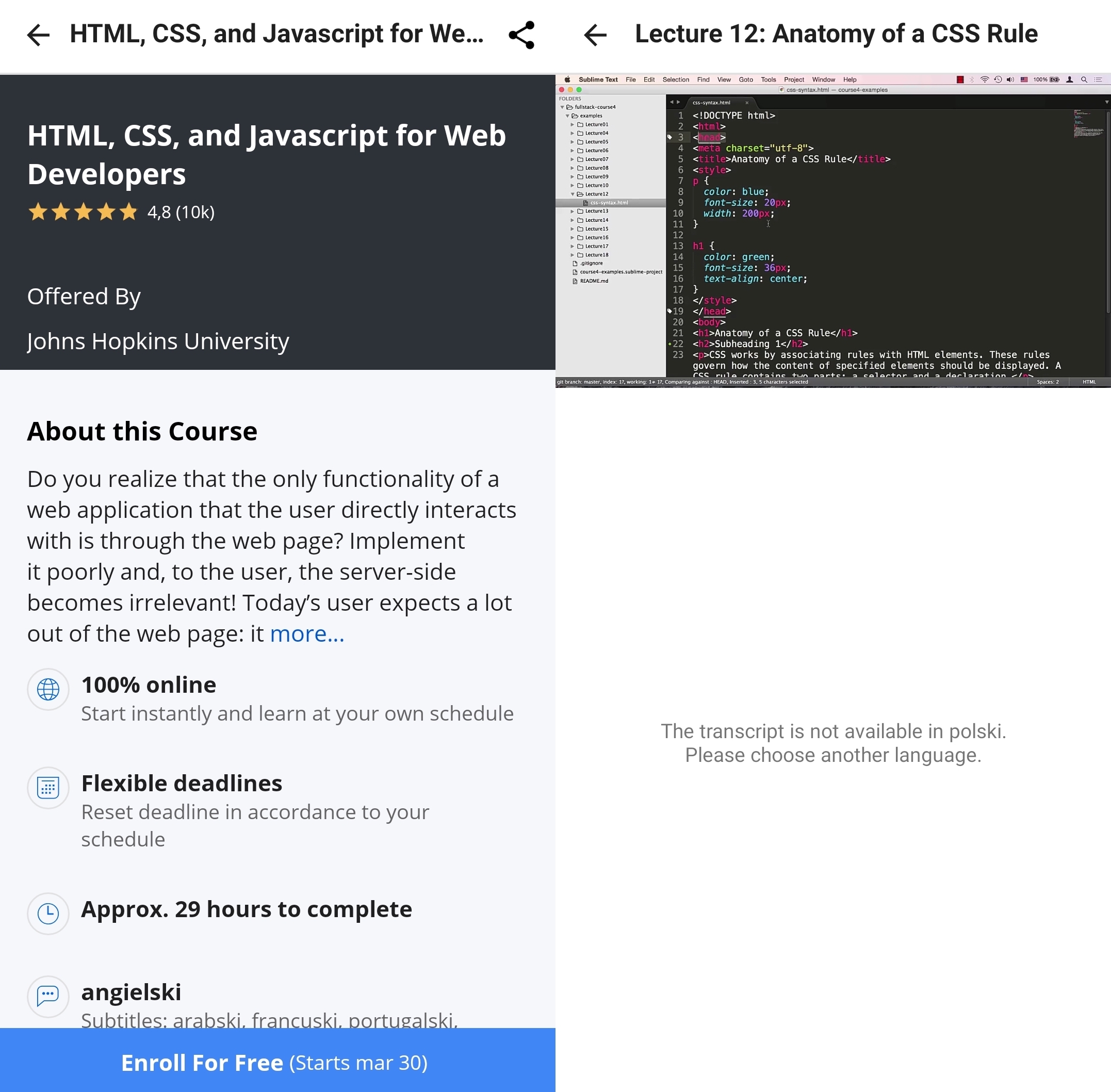 W rozdziale Jak nauczyć się programowania? wspominaliśmy o platformach z kursami o charakterze raczej akademickim. Najpopularniejsze mają swoje aplikacje mobilne, pozwalające na naukę na telefonie. Umożliwiają one często na naukę w trybie offline czy odtwarzanie kursu na słuchawkach przy wyłączonym ekranie. Jest to spora wygoda, na przykład gdy jesteśmy w podróży (wiele kursów ukończyłem w pociągach i samolotach). Ponownie polecę platformy edX i Coursera, gdzie znajdziemy wiele darmowych kursów prowadzonych często przez światowej sławy autorytety[^404_1].