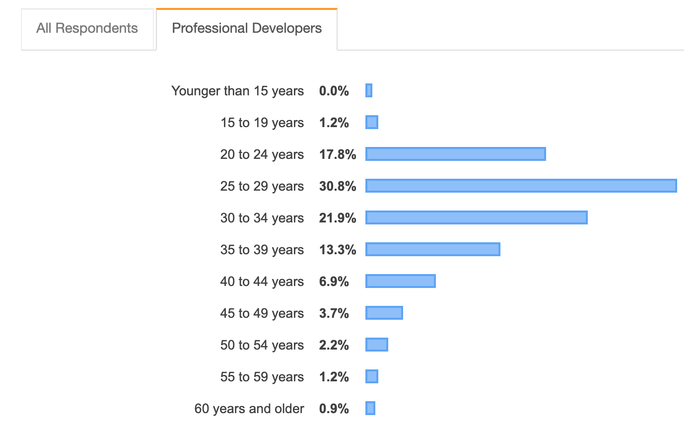 Co jednak znacznie ważniejsze, struktura wieku wskazuje pośrednio na to, jak będzie się zmieniała liczba programistów z czasem. Studia programistyczne należą do chętnie wybieranych, a młodym ludziom często nie brakuje ambicji, by zdobyć lukratywną pracę w branży. Ma to niebagatelny wpływ na wzrost liczby programistów.