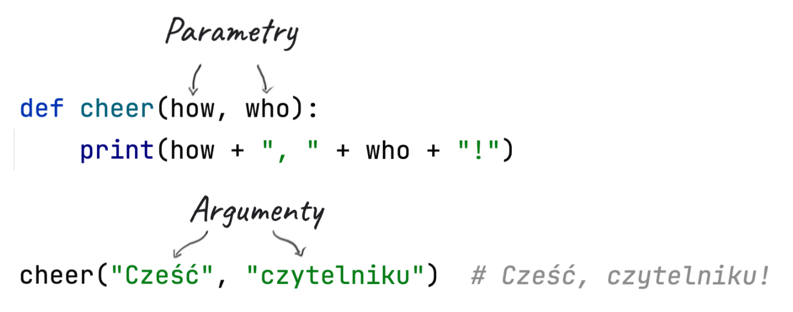 def cheer(who_to_cheer): print(f"Siema {who_to_cheer}!") cheer("Czytelniku") # Siema Czytelniku! cheer("Wszystkim") # Siema Wszystkim! cheer(42) # Siema 42!