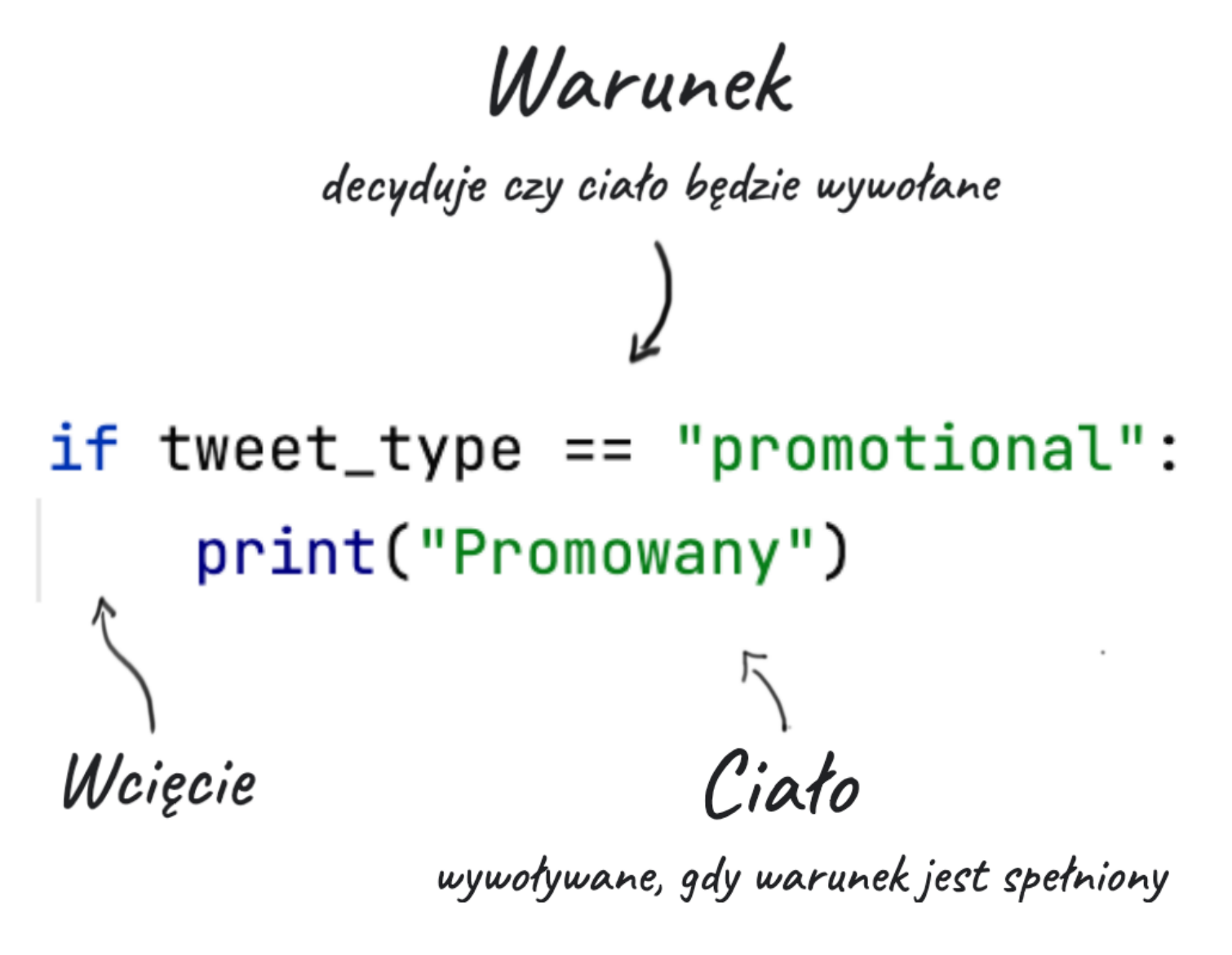tweet_type = "standard" if tweet_type == "promotional": print("Promowany") else: print("Zwykły") # Efekt ten sam, co gdybyśmy zrobili: if tweet_type == "promotional": print("Promowany") if tweet_type != "promotional": print("Zwykły")