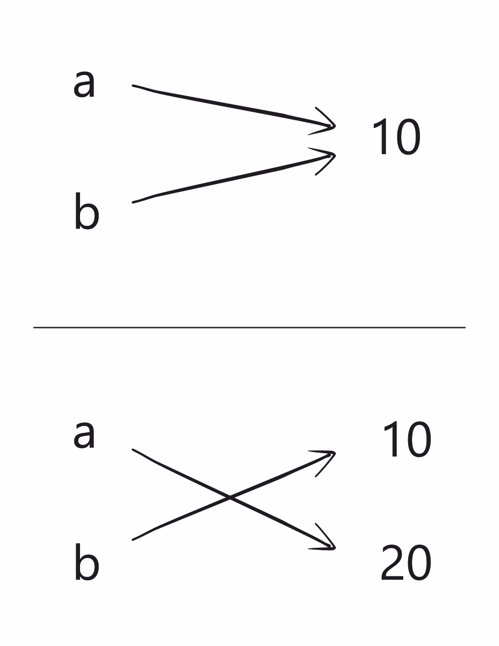 a = 10 b = a a = 20 print(b) # 10, # ponieważ b wskazuje na wartość 10, a nie na zmienną print(a) # 20