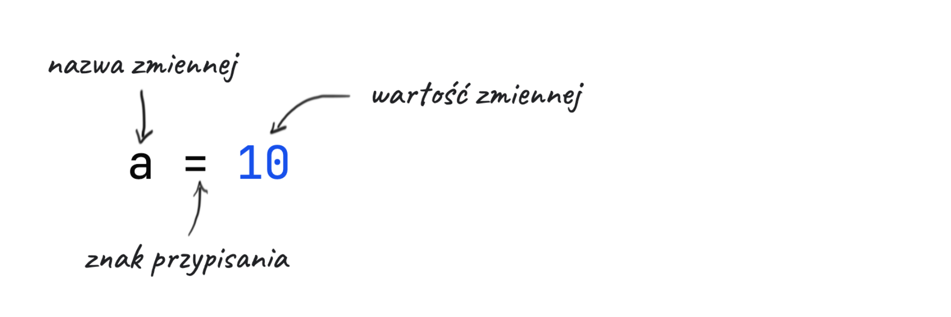Aby utworzyć zmienną w Pythonie, wystarczy podać jej nazwę, użyć znaku przypisania = (a więc pojedynczy znak równości) i po jego prawej stronie określić wartość tej zmiennej.