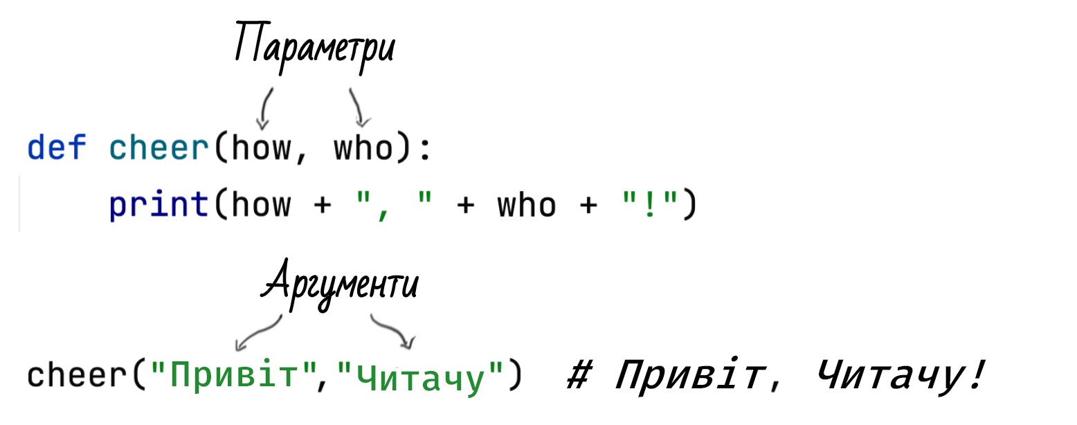 def cheer(who_to_cheer): print(f"Хей, {who_to_cheer}!") cheer("Читачу") # Хей, Читачу! cheer("Усі") # Хей, Усі! cheer(42) # Хей, 42!