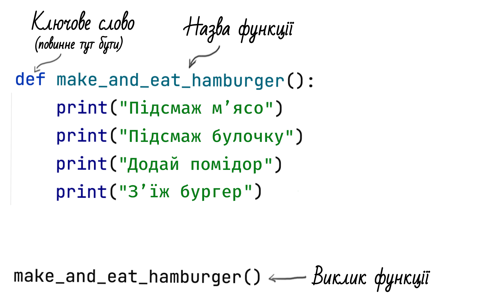 # Визначення функції def make_and_eat_hamburger(): # Тіло функції print("Підсмаж м’ясо") print("Підсмаж булочку") print("Додай помідор") print("З’їж бургер") print("Встань із ліжка") print("Почисть зуби") make_and_eat_hamburger() # Використання функції print("Працюй") make_and_eat_hamburger() # Використання функції print("Працюй") make_and_eat_hamburger() # Використання функції print("Пограй у гру") print("Іди спати")
