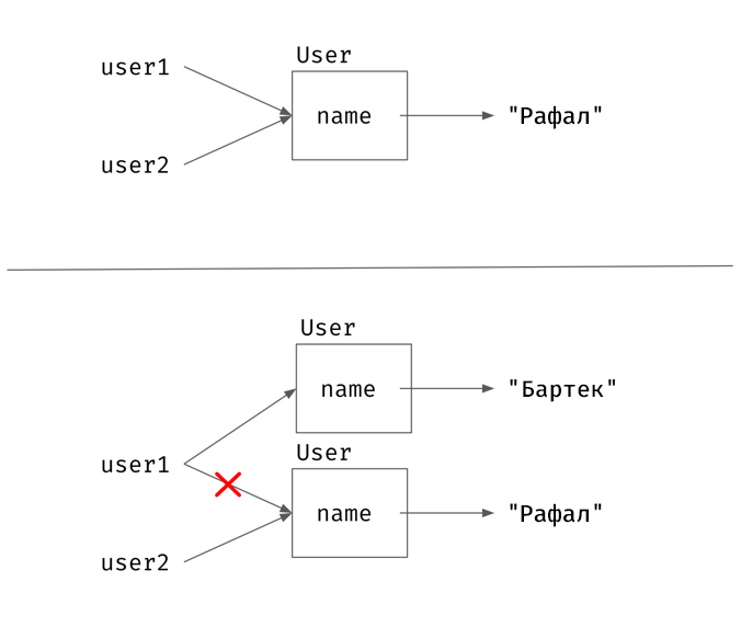 user1 = User("Рафал") user2 = user1 print(user1.name) # Рафал print(user2.name) # Рафал user1 = User("Бартек") print(user1.name) # Бартек print(user2.name) # Рафал