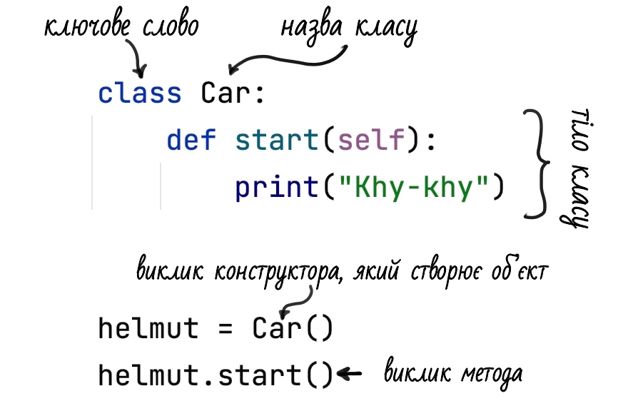 Клас — це свого роду шаблон для створення об’єктів. За аналогією, клас — це рецепт, а предмет — приготована страва. Клас визначає, що об’єкт повинен містити і як поводитися.