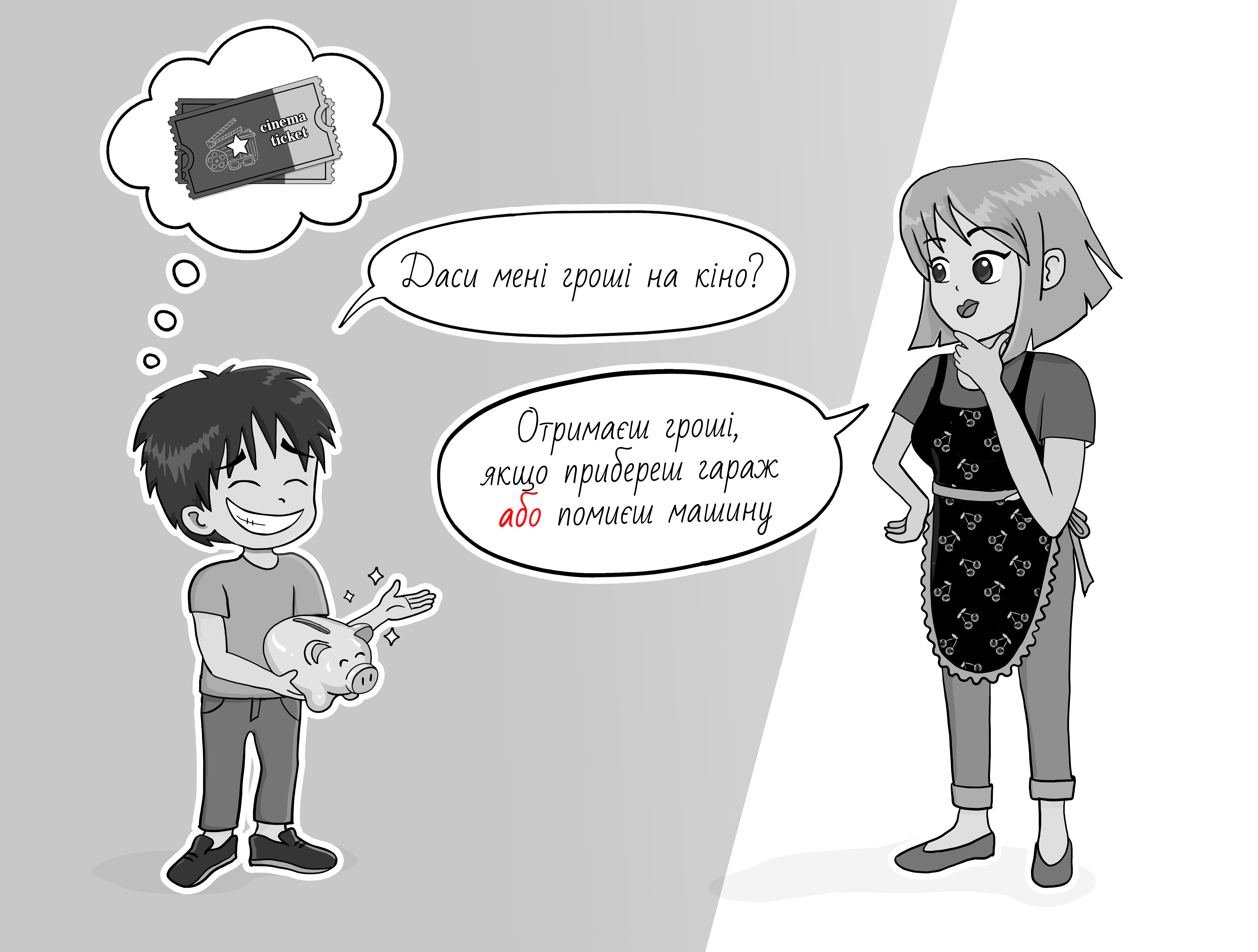 Мишко так запрацювався, що і гараж прибирав, і машину помив. Здивована мама сказала: "Я хотіла, щоб ти зробив або те, або інше, а не і одне, і друге". Мишко відповів: "Ти використала сполучник або, який, серед іншого, може означати виконання і одного, і іншого, так само як or у програмуванні". Мама Мишка погодилася з цим поясненням, тому він пішов з друзями в кінотеатр.