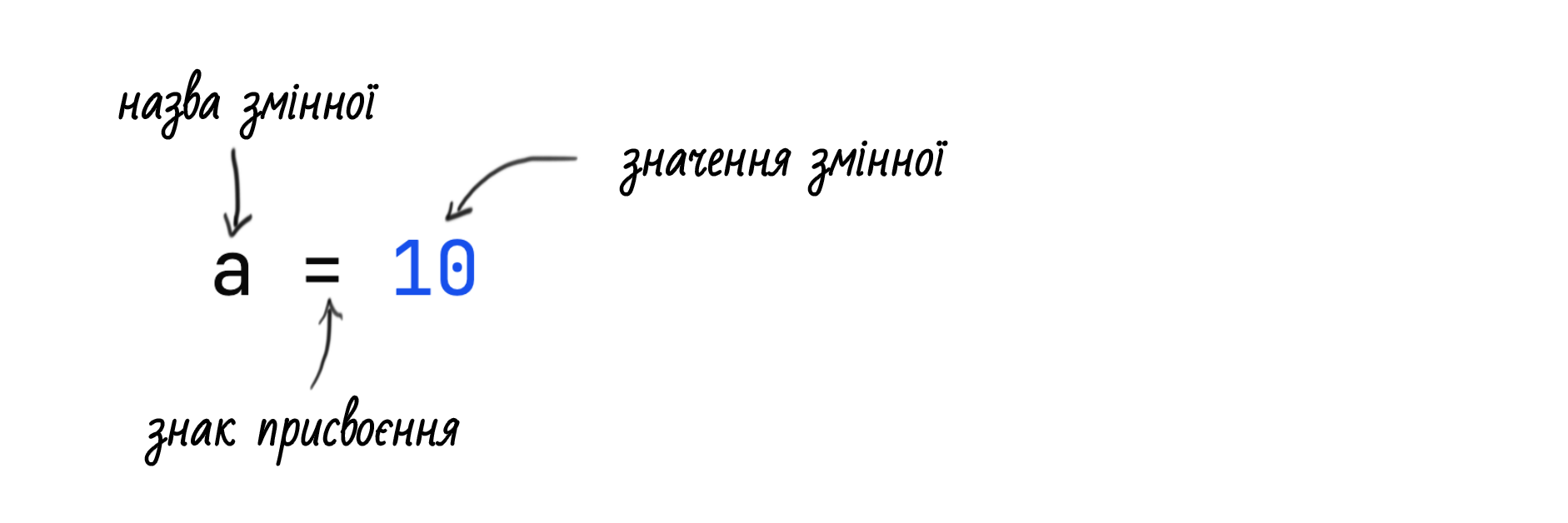 a = 10 print(a) # 10 b = "Привіт" print(a) # 10 print(b) # Привіт